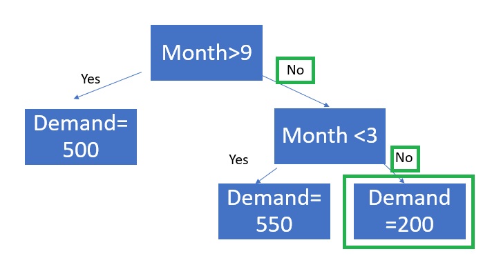 In this case, there is only one feature (month), and tree depth is two. The tree depth is the length of the longest path to a terminal node. To generate a forecast, the model starts at the top of the tree and uses the feature values to move through the tree until a terminal (“leaf”) node is reached. Here, the leaf nodes are the “Demand” nodes. For example, suppose it is June, or month = 6.