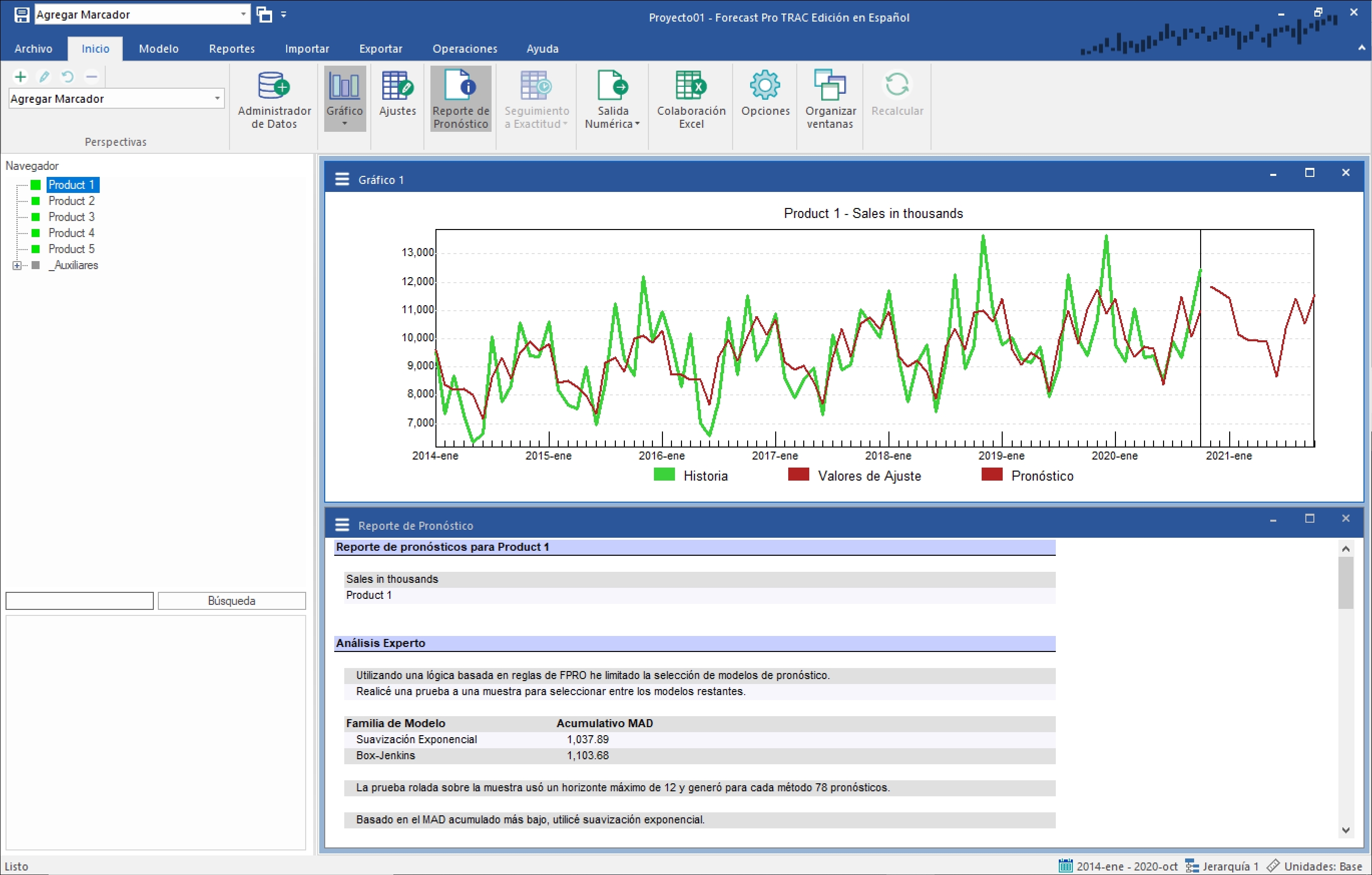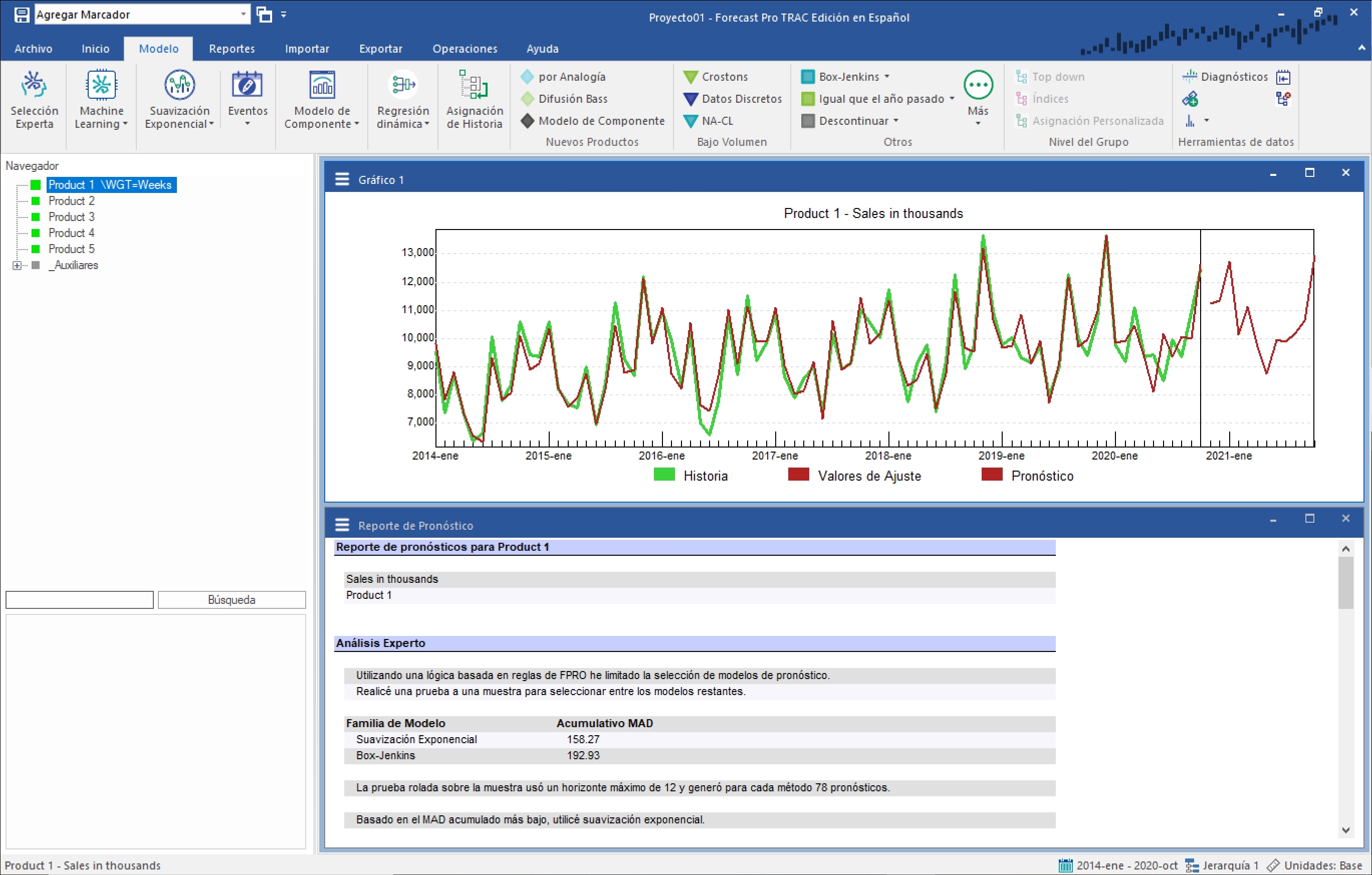 Haz clic derecho en Product 1 para abrir el menú de contexto del Navegador. Selecciona Aplicar Modificador(es) A>Todos los Ítems. Debido a que los otros cuatro productos utilizan el mismo calendario, aplicar la transformación de ponderación mejora el modelo en todos los casos.