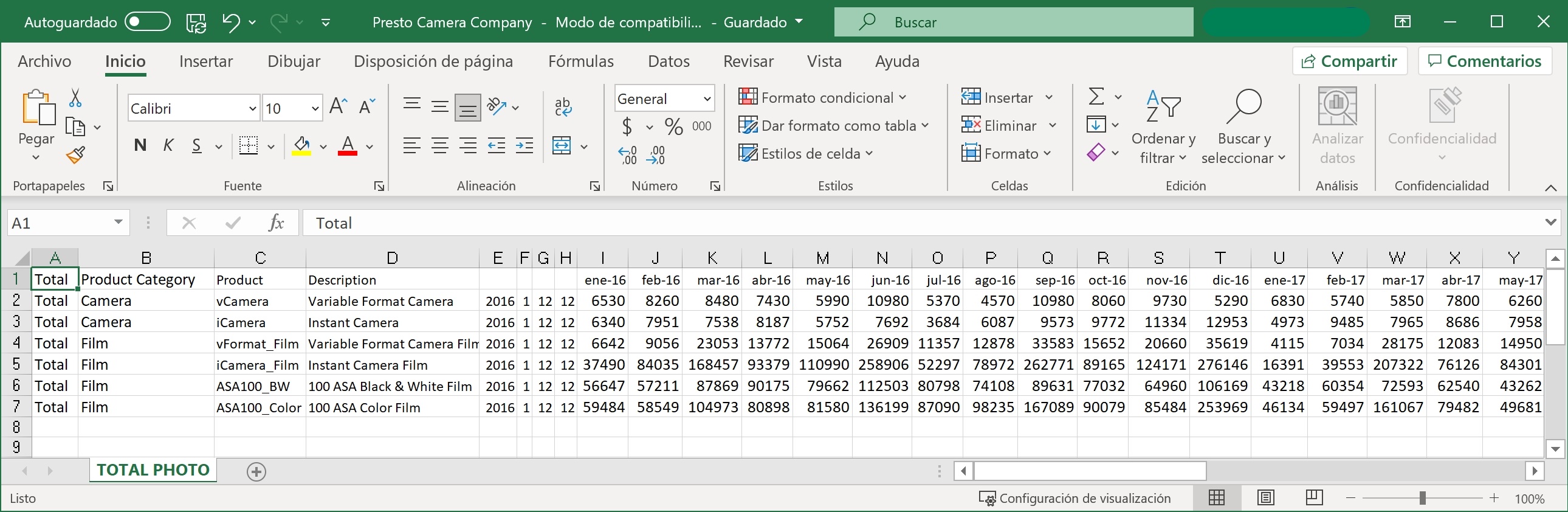 La hoja de cálculo Presto Camera Company.xls se muestra arriba.