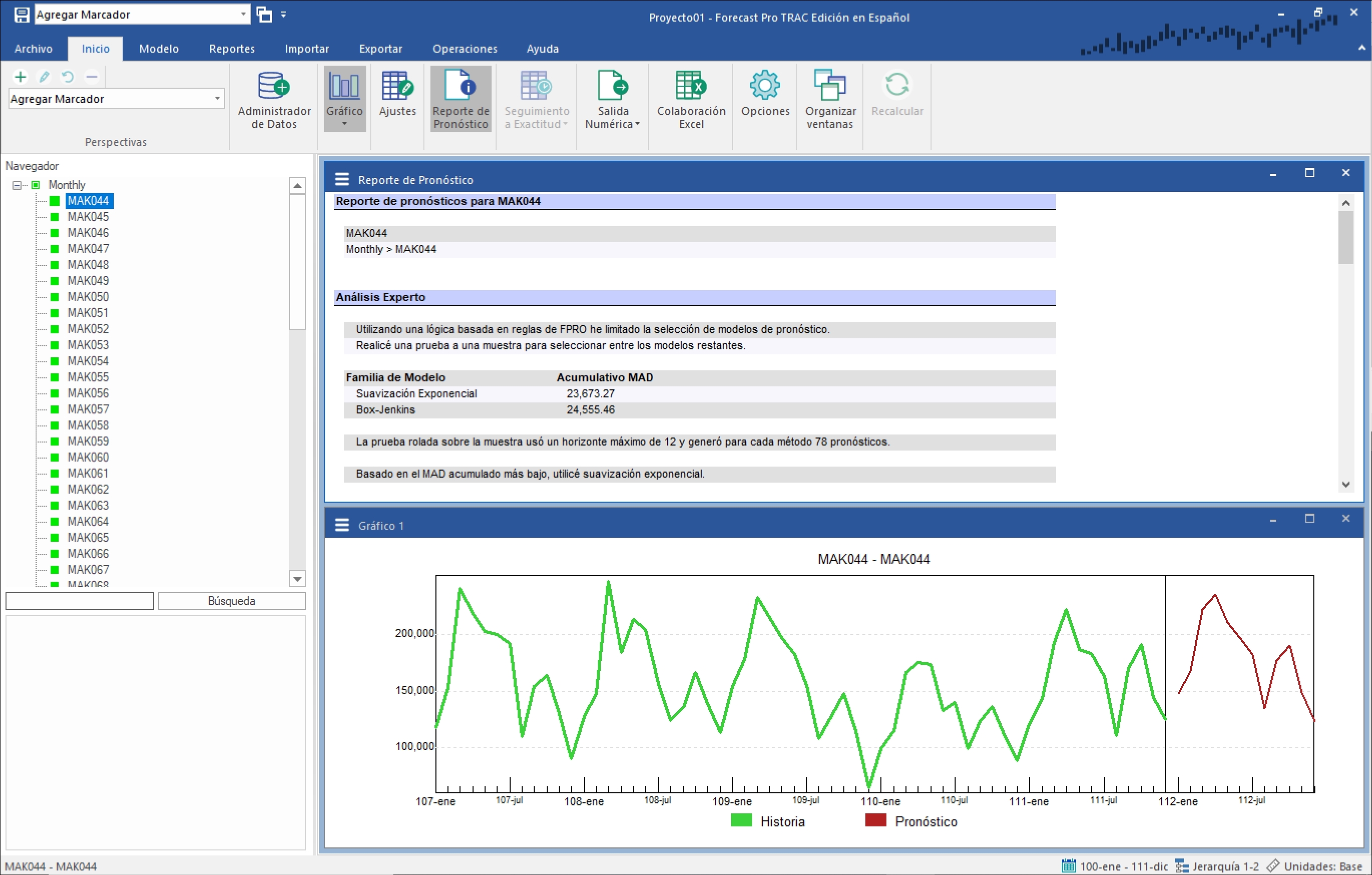 Haz clic derecho en el Navegador para abrir su menú de contexto y selecciona Expandir todo para expandir el Navegador en su totalidad. Cierra la ventana de Ajustes. Abre el Reporte de Pronóstico haciendo clic en su ícono y selecciona la opción de Organizar Ventanas para maximizar la ventana del reporte. Selecciona Monthly>MAK044 en el Navegador. Tu pantalla se debería de ver como la que se muestra a continuación.
