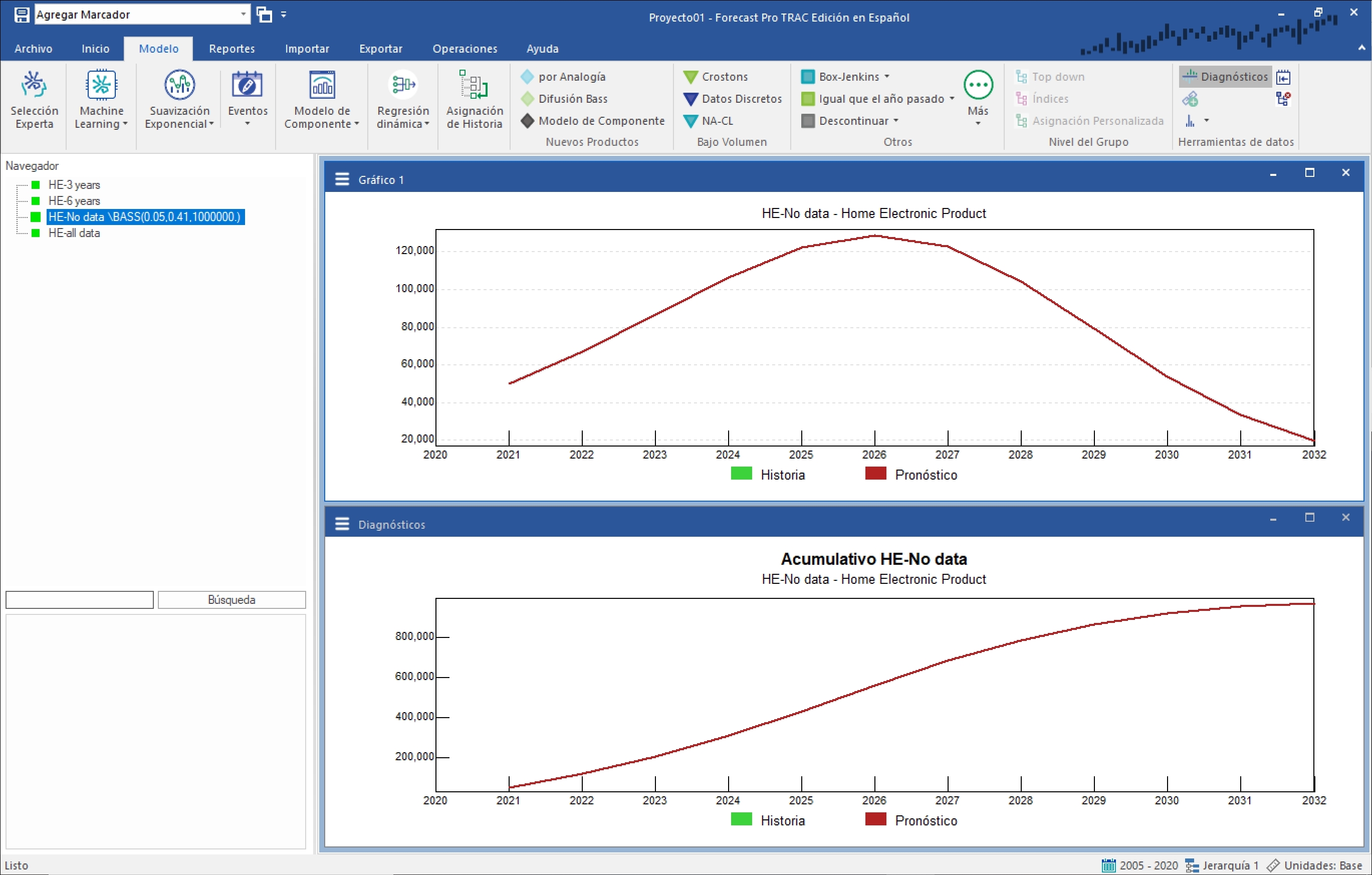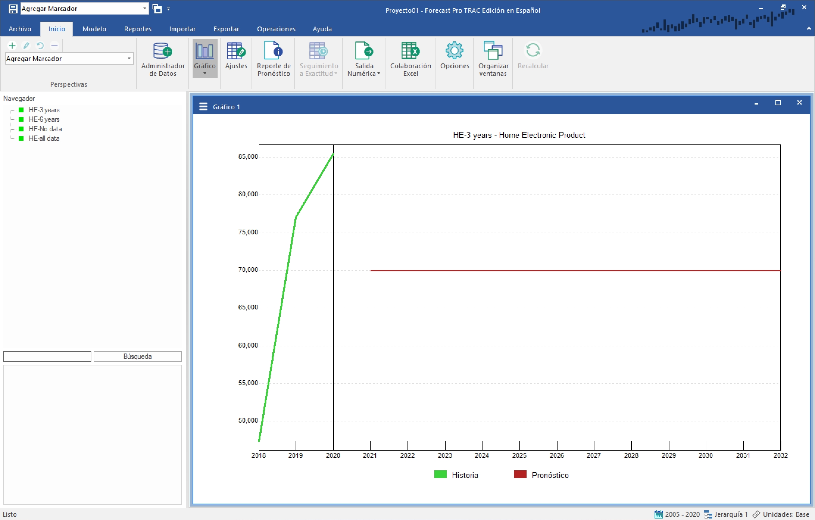 Inicia el programa y haz clic en el ícono de Proyecto Nuevo. En la pestaña de Inicio, abre el Administrador de Datos. Haz clic en el desplegable de Agregar en la fila de Datos Históricos, selecciona Excel y selecciona el archivo Home Electronic Product.xls para añadirlo a la fila de Datos Históricos. Haz clic en Leer y Pronosticar y después cierra el Administrador de Datos. Cierra la Ventana de Consenso.