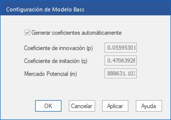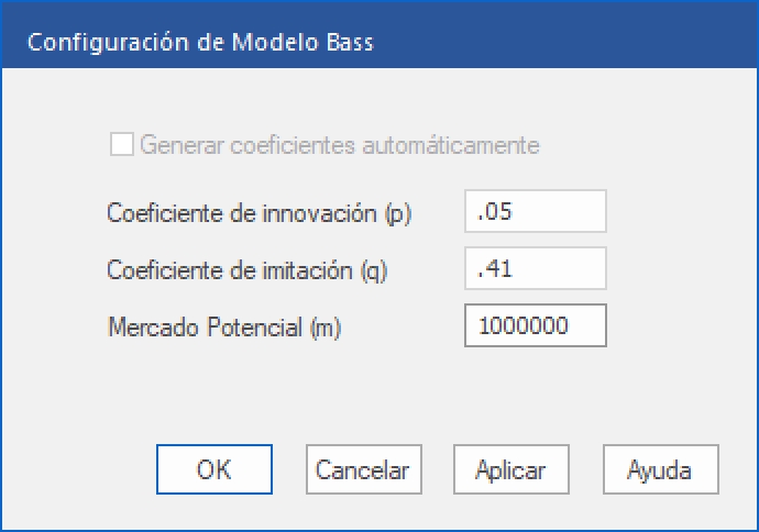 Si tienes 5 o más puntos de datos históricos, estos coeficientes pueden ser ajustados a los datos. Para construir un modelo de Bass con menos de 5 puntos de datos debes establecer los valores para estos coeficientes junto con el número total de adoptadores potenciales.