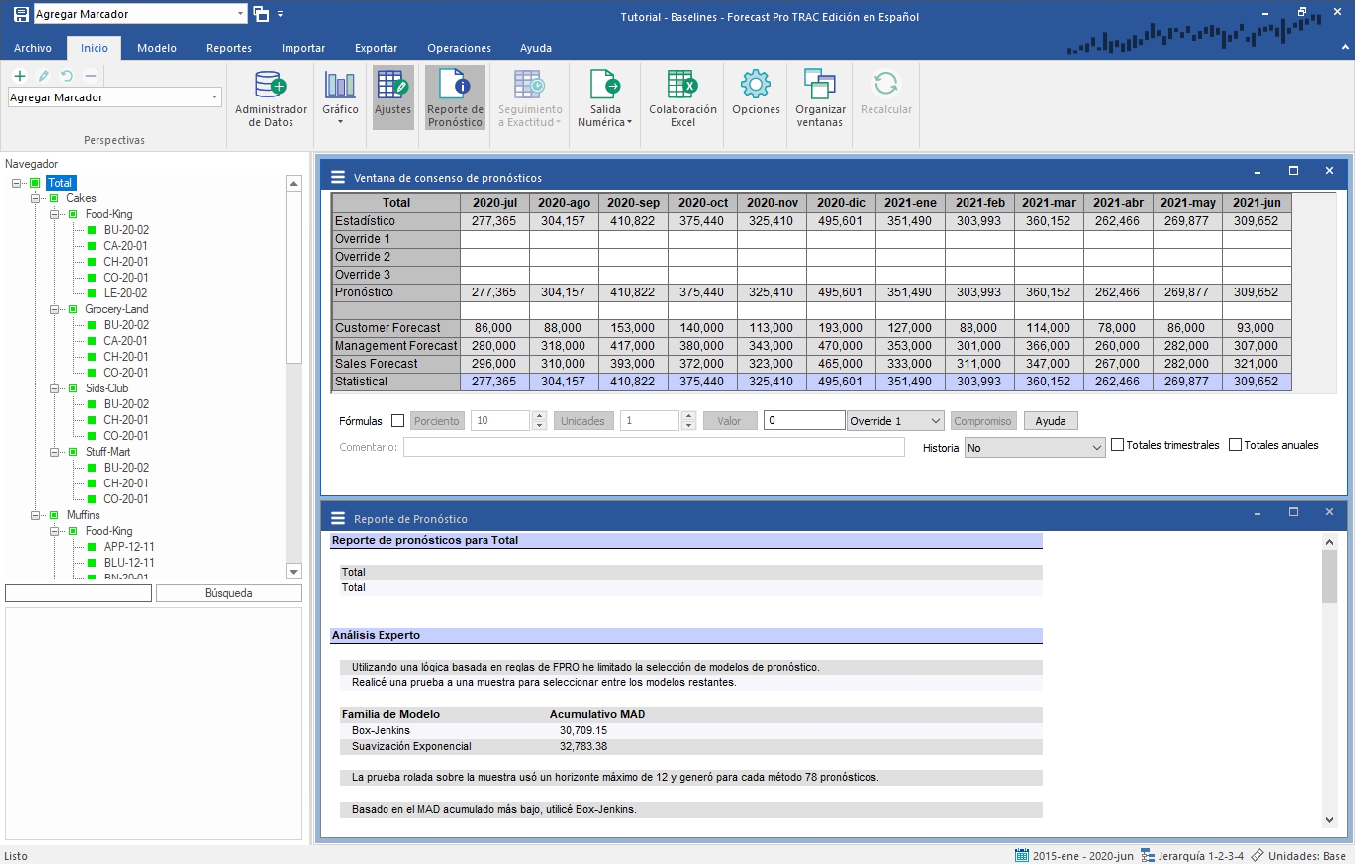 Selecciona Total>Cakes>Grocery-Land. Observa que la fila de pronóstico base (primera fila en la ventana actual) es etiquetada “Estadístico”. Selecciona Total>Cake>Food-King. Observa que la fila de pronóstico base (primera fila en la ventana actual) es etiquetada “Base”, debido a que hemos especificado un pronóstico base alternativo para algunos de los SKUs que forman parte de este grupo.