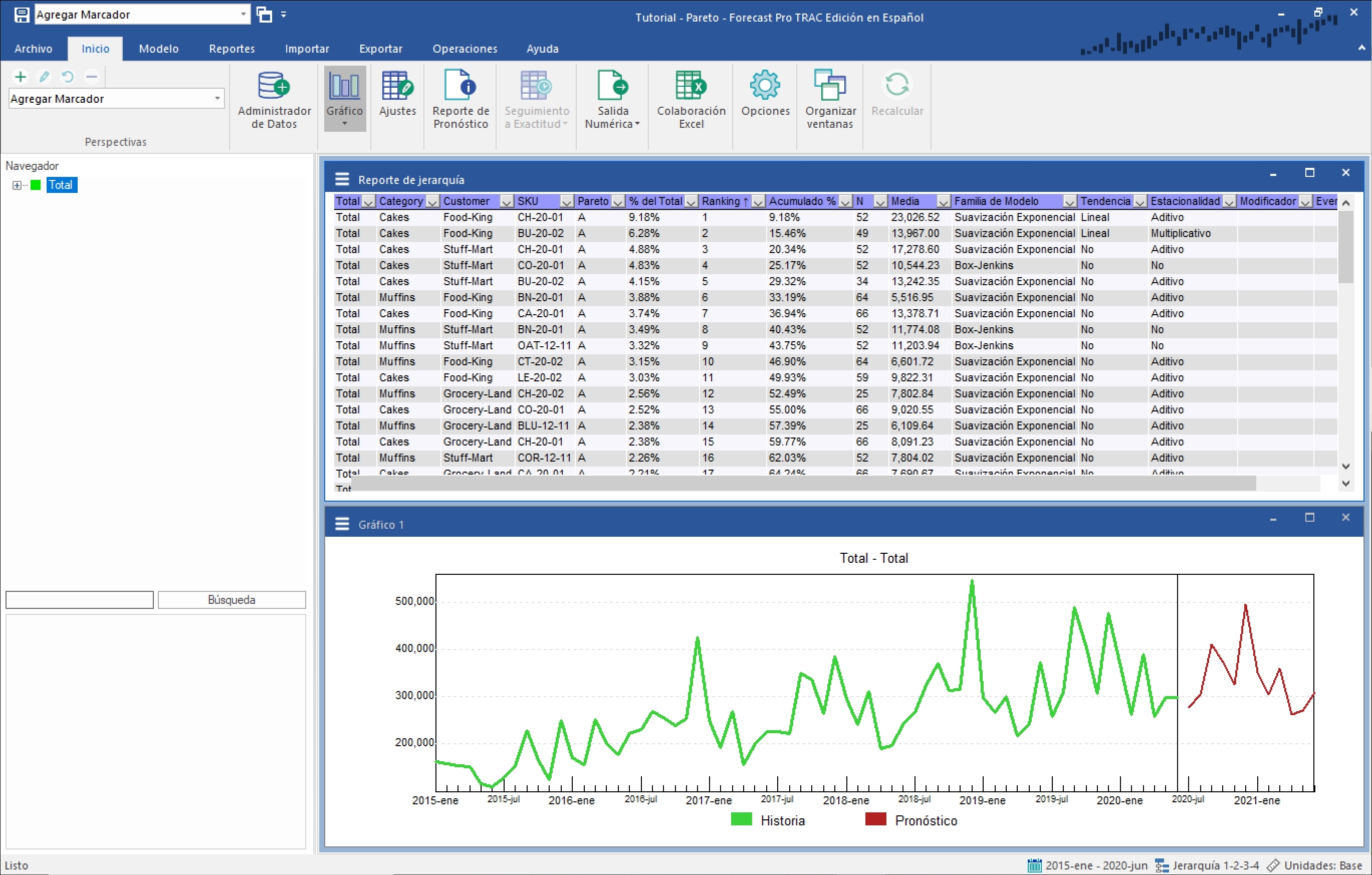Haz clic en el desplegable para la columna de Pareto, establece el filtro para que solamente el tipo A sea mostrado y haz clic en OK. Analiza el reporte filtrado. Haz doble clic en el item con el ranking más alto en el reporte y después doble clic en el segundo. Observa que el Navegador inmediatamente se actualiza para mostrar el item seleccionado. Las facilidades de ordenar, filtrar y navegar haciendo doble clic en items pueden ser muy convenientes al momento de revisar tus pronósticos.
