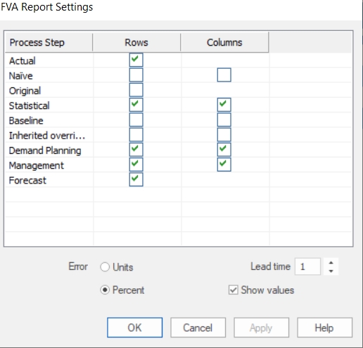 La columna de la izquierda muestra los pasos disponibles. Observa que el pronóstico Naïve es igual al real del periodo anterior (lo mismo que el periodo pasado). Puedes elegir qué pasos del proceso quieres mostrar como filas en el reporte FVA y qué pasos del proceso quieres comparar como columnas. Activar los recuadros de la columna “Estadístico” le indica a Forecast Pro que incluya una columna de “FVA vs. Estadístico”.