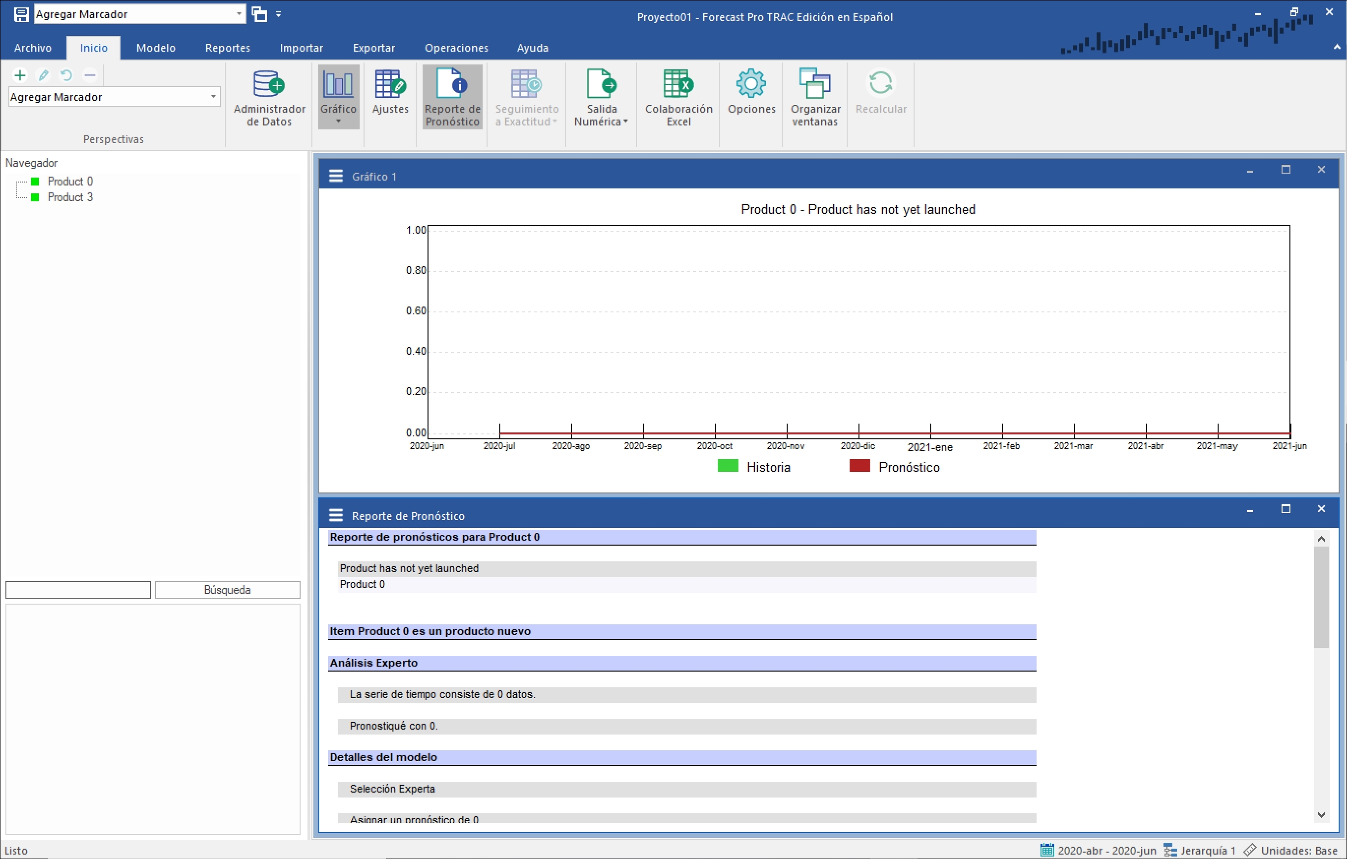Inicia el programa y haz clic en el ícono de Nuevo Proyecto. Abre el Administrador de Datos, selecciona el archivo New Product- Historic Data.xlsx para añadirlo a la fila de Datos Históricos, haz clic en el botón Leer y Pronosticar y cierra el Administrador de Datos. Cierra la Ventana de Consenso y abre la vista de Reporte de Pronóstico haciendo clic en su ícono en la pestaña de Inicio. Selecciona Product-0 en el Navegador. Tu pantalla se debería de ver como la que se muestra a continuación.