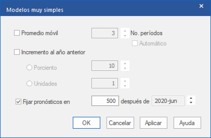Otra opción es utilizar el modelo de Valor de Pronóstico Fijo. Este modelo te permite establecer el pronóstico estadístico en un valor específico. Dirígete a la pestaña de Modelo y haz clic en el ícono de Más en el grupo Otro y después selecciona Valor fijo para abrir la ventana de Modelos Muy Simples que se muestra a continuación.
