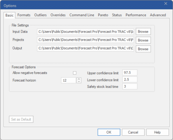 Let’s take a closer look at the Basic options. Forecast Pro reads in the historical data from the Input Data directory. Project files are saved to the Projects directory. Forecast files and reports are written to the Output directory. You can also set the percentiles for the confidence limits, the lead time for safety stock calculations, the length of the forecasts (forecast horizon), and you can indicate if Forecast Pro should allow negative forecasts.