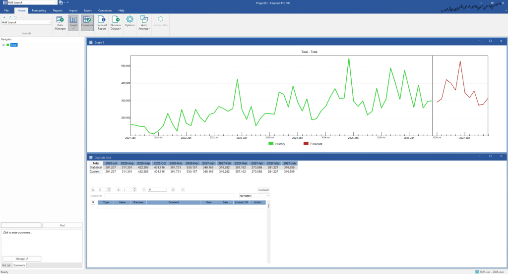 There will undoubtedly be times when you want to judgmentally override the statistical forecasts. For instance, you may know of a large incoming order and need to change a number or two. Forecast Pro allows you to make these changes quickly and easily.