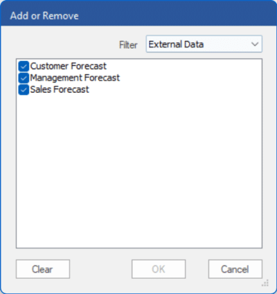 Click on the Add or Remove button to bring up the Add or Remove dialog box. Click on the Filter drop-down on the top of the dialog box and select External Data. The three new rows that we just imported from Excel are listed.