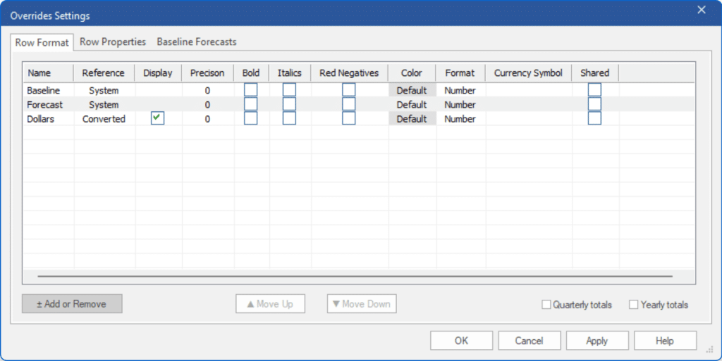 Select all 3 rows and click OK to return to the Override Grid dialog box. Notice that the Reference column lists our three new rows as External and all three rows have checkmarks in the Display box. Click Apply to add these rows to the Override Grid display without leaving the settings box. Remove the checkmarks from the Display column for the Sales Forecast and Customer Forecast rows and click OK to update the display and exit the dialog box.